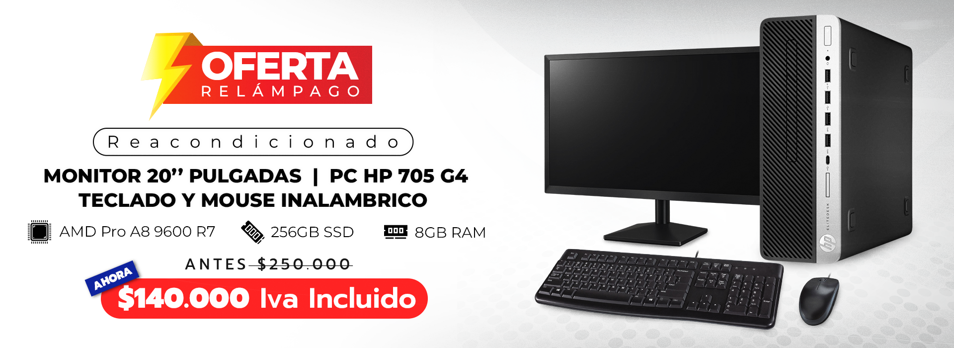 Computadora HP 705 G4 con Monitor de 20 pulgadas, teclado y mouse inalámbrico